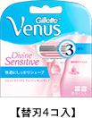 Standard Venus 3-blade razor. Razor heads have rubber buffer strips on top and bottom for a smooth shave and a lubricating strip on the bottom. The only classic-design refills in Japan come in Divine Sensitive only. All other Venus refill razor heads will also fit this handle.